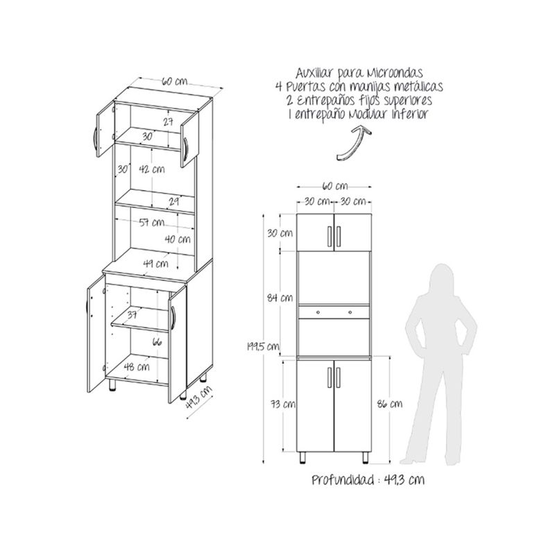 Descubre la elegancia y funcionalidad de nuestra Alacena Moderna, imagina una alacena que no solo organiza tu cocina, sino que también añade un toque de sofisticación y estilo contemporáneo. Cuenta en general con 4 puertas, nichos abiertos y es, además incluye el mesón espacio para horno, microondas o decoración.