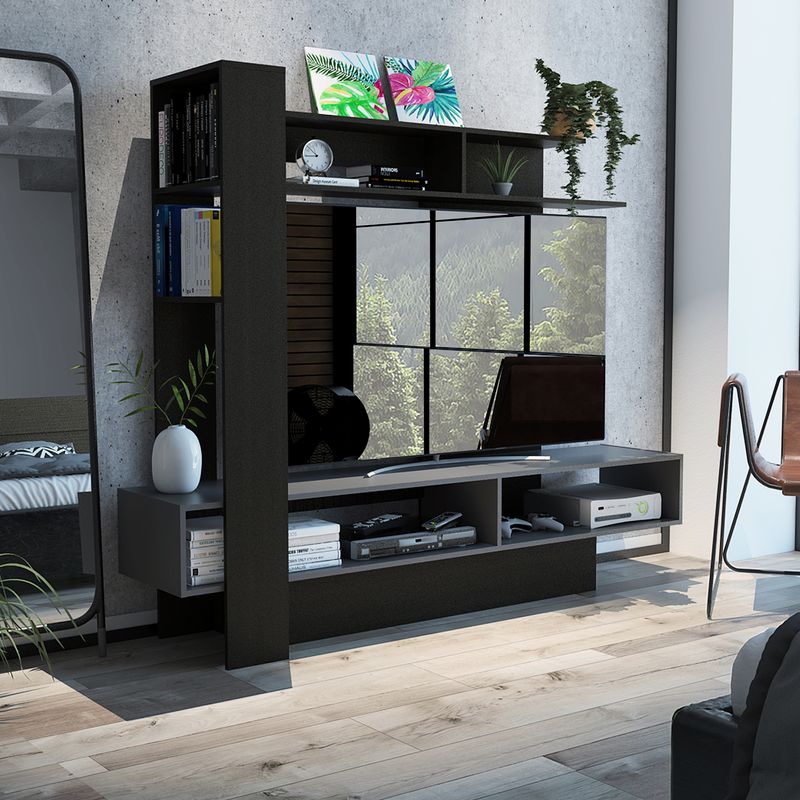 Este mueble espectacular para TV cuenta con un diseño que brinda armonia y amplitud, con espacios necesarios para organizar y colocar objetos decorativos que brinden comodidad y tranquilidad a la hora de disfrutar de una buena pelicula o ver tu programa favorito. Es el articulo ideal para tu sala, habitación o estudio proyectado para la simplicidad, creando un ambiente innovador y al mismo tiempo muy confortable, a excelente costo beneficio adaptándose a cualquier ambiente de la casa.