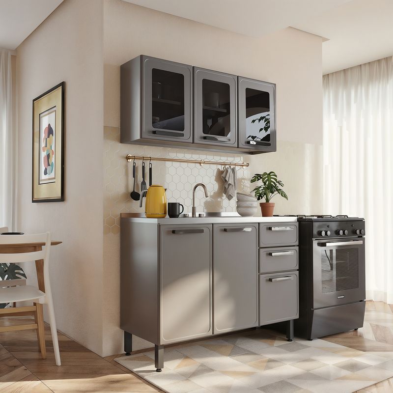 Mueble inferior Incluye lavaplatos en acero inoxidable, lado central, 3 cajones con gran espacio, rieles telescópicos con apertura total y 2 puertas.