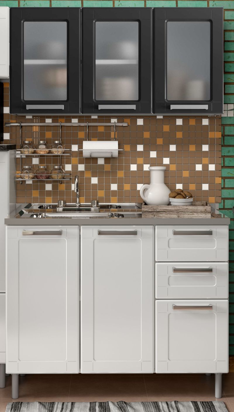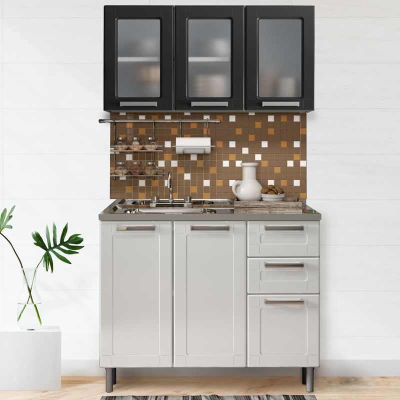 Combo de Mueble Inferior para cocina, con dos cajones y tres puertas en acero carbonado, fregadero de acero inoxidable, patas con altura regulable color blanco con brillo UV mas Mueble Superior con tres puertas en acero carbonado con vidrio, color negro con brillo UV, gran espacio para almacenar todo lo necesario en un solo sitio, con atractivo acabado, manijas exclusivas con protección UV, bisagras de acero y con diseño totalmente moderno.