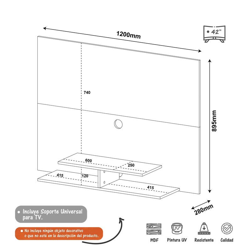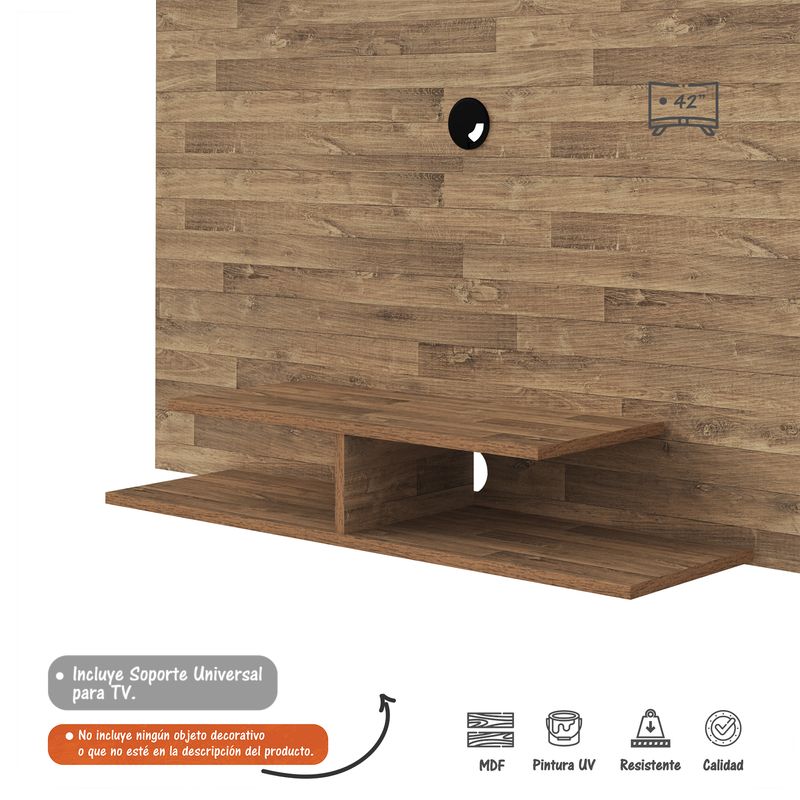 Además, cuenta con nichos para aparatos electrónicos, entre paños, espacio para “Pantalla de hasta 42”. Ya viene con los herrajes para fijar la pantalla al panel, lugares para accesorios y/o decoraciones, sistema de cables ocultos.