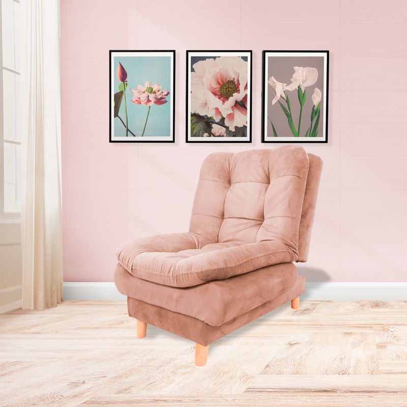 Poltrona firme de gran confort, excelente soporte, 3 posiciones, tapizado en tela tipo Lino color Camel, patas en madera con antideslizante, estructura en madera Pino-inmunizada y espuma de alta densidad.